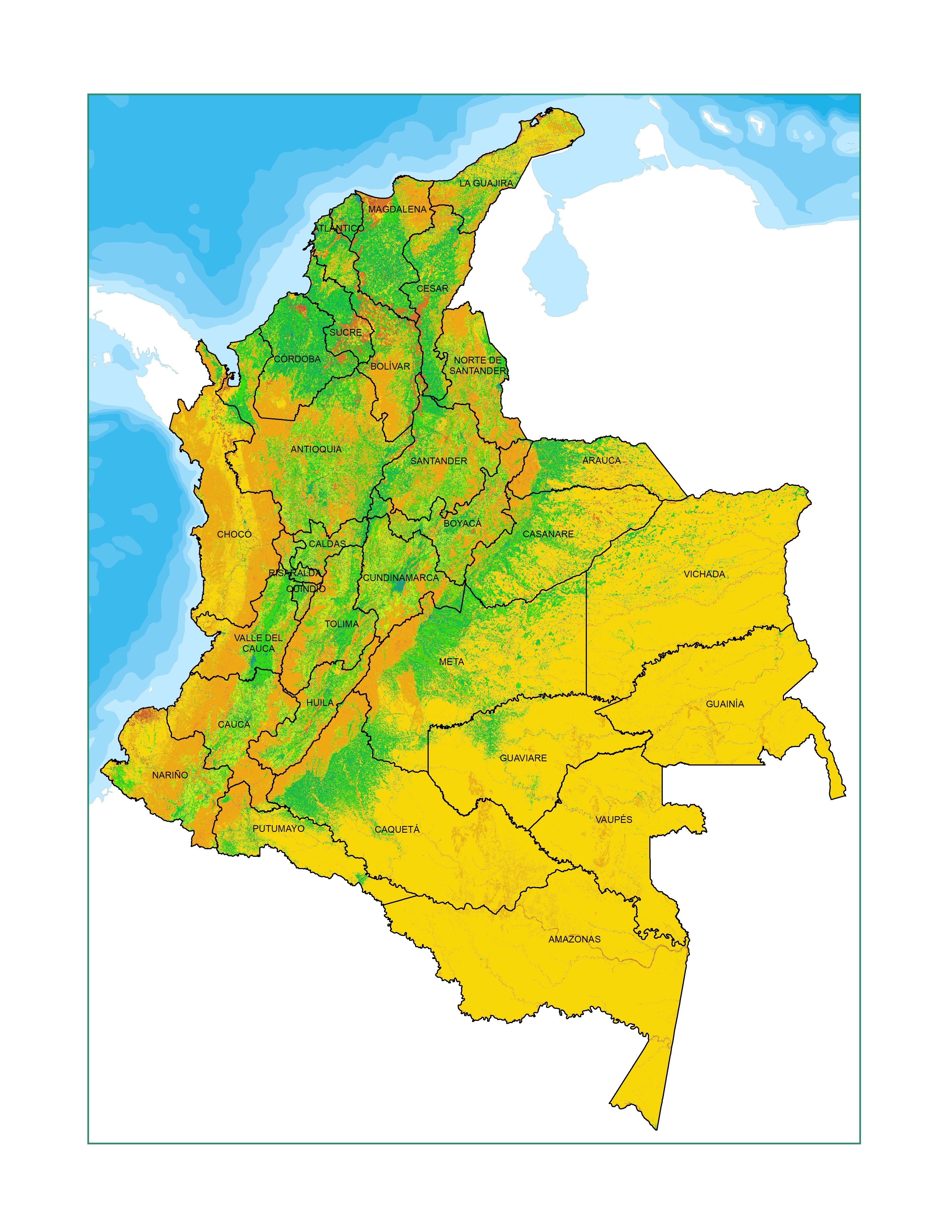 Copyright Text: Fuente de datos: ANI (2020). Red vial concesionada. Ideam (2016). Mapa de Bosque No Bosque Colombia- Área Continental (Escala Fina LANDSAT) año 2010, versión 5. —(2021). Mapa de cobertura de la tierra metodología Corine Land Cover adaptada para Colombia, escala 1: 100.000 periodo 2018. IGAC (2014). Modelo digital de terreno, resolución espacial 90 m. — (2020). Cartografía básica de Colombia: Vías. esc. 1:100.000. Invías (2020). Red vial no concesionada. Mintransporte (2014) Mapa de rutas fluviales. — (2020). Red vial departamental. — (2020). Red vial nacional. © openrouteservice.org by HeiGIT Map data © OpenStreet Map contributors.
